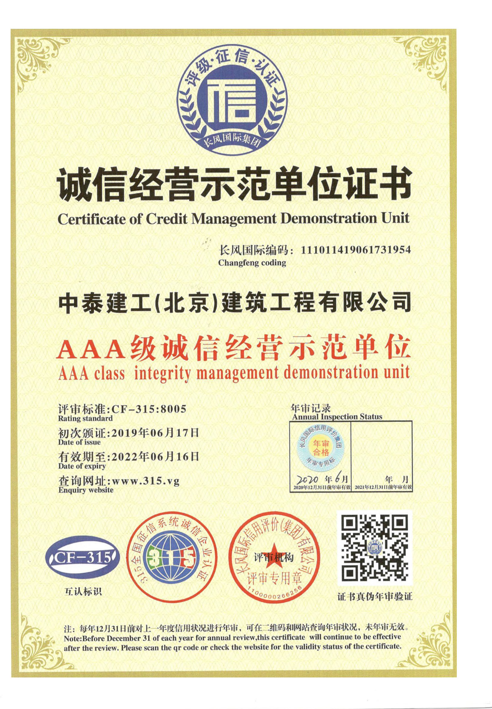 誠信經營示范單位證書