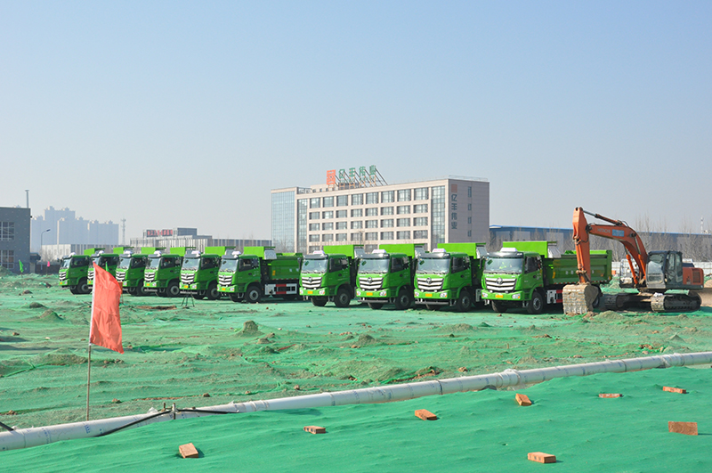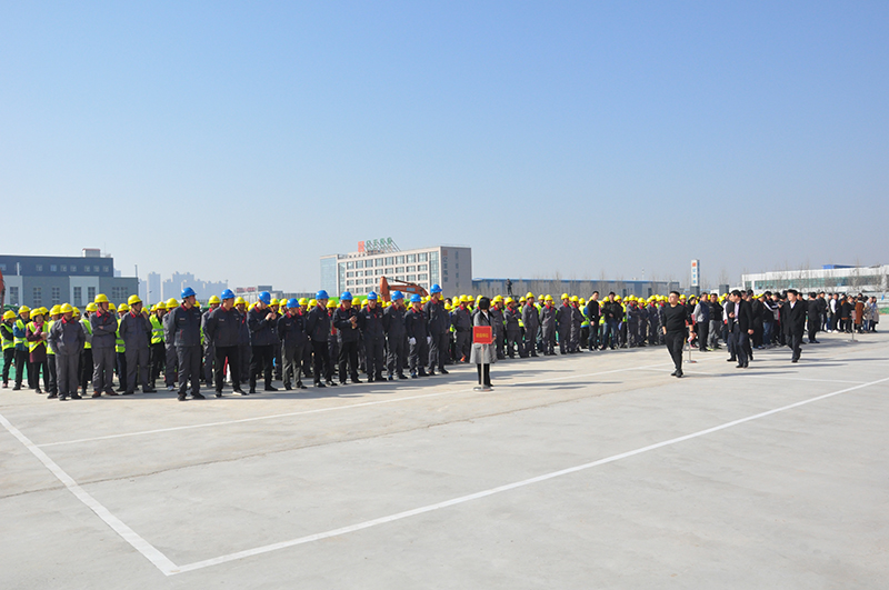 在三河市重點項目集中開工現場會會場,大型機械裝備整齊排列,工人們整裝待發。
